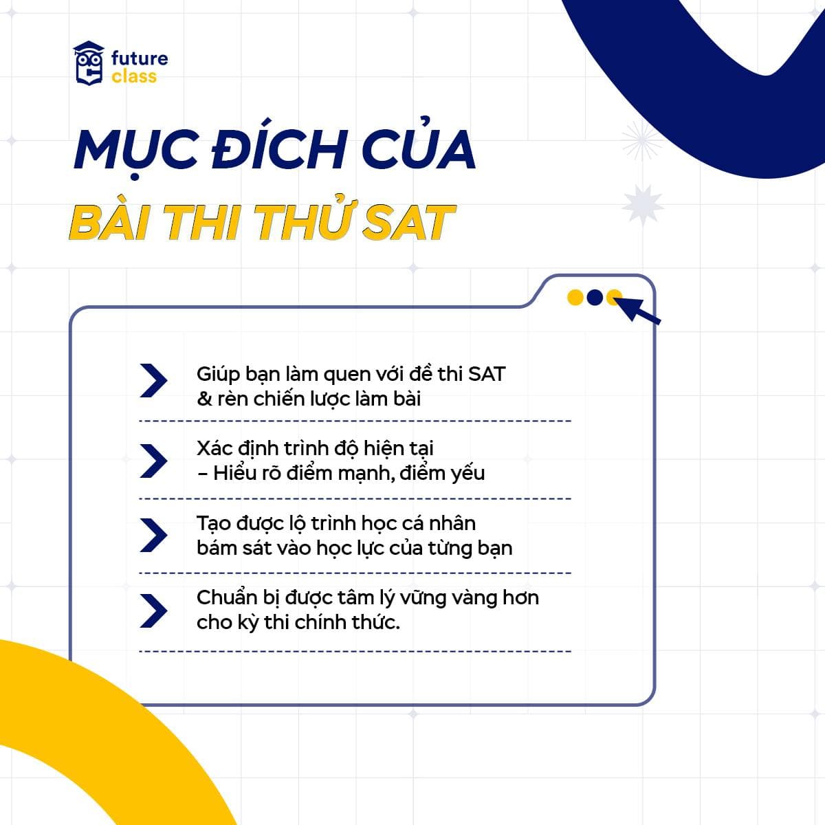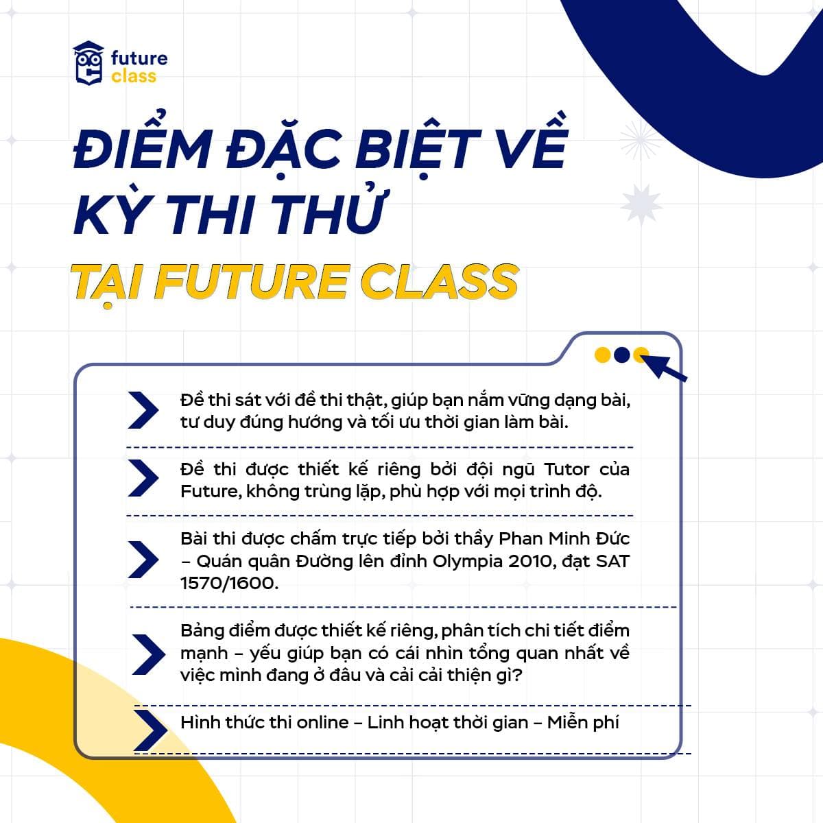 • Đối với Future Class, việc thi thử SAT định kỳ vô cùng quan trọng vì nó giúp mình biết mình đang ở đâu và cần gì để cải thiện. Đó là lý do Future Class tạo ra bài thi thử SAT online – để bạn có cơ hội kiểm tra trình độ, làm quen với bài thi mà không phải chờ đến ngày thi thật mới biết mình còn thiếu sót gì.