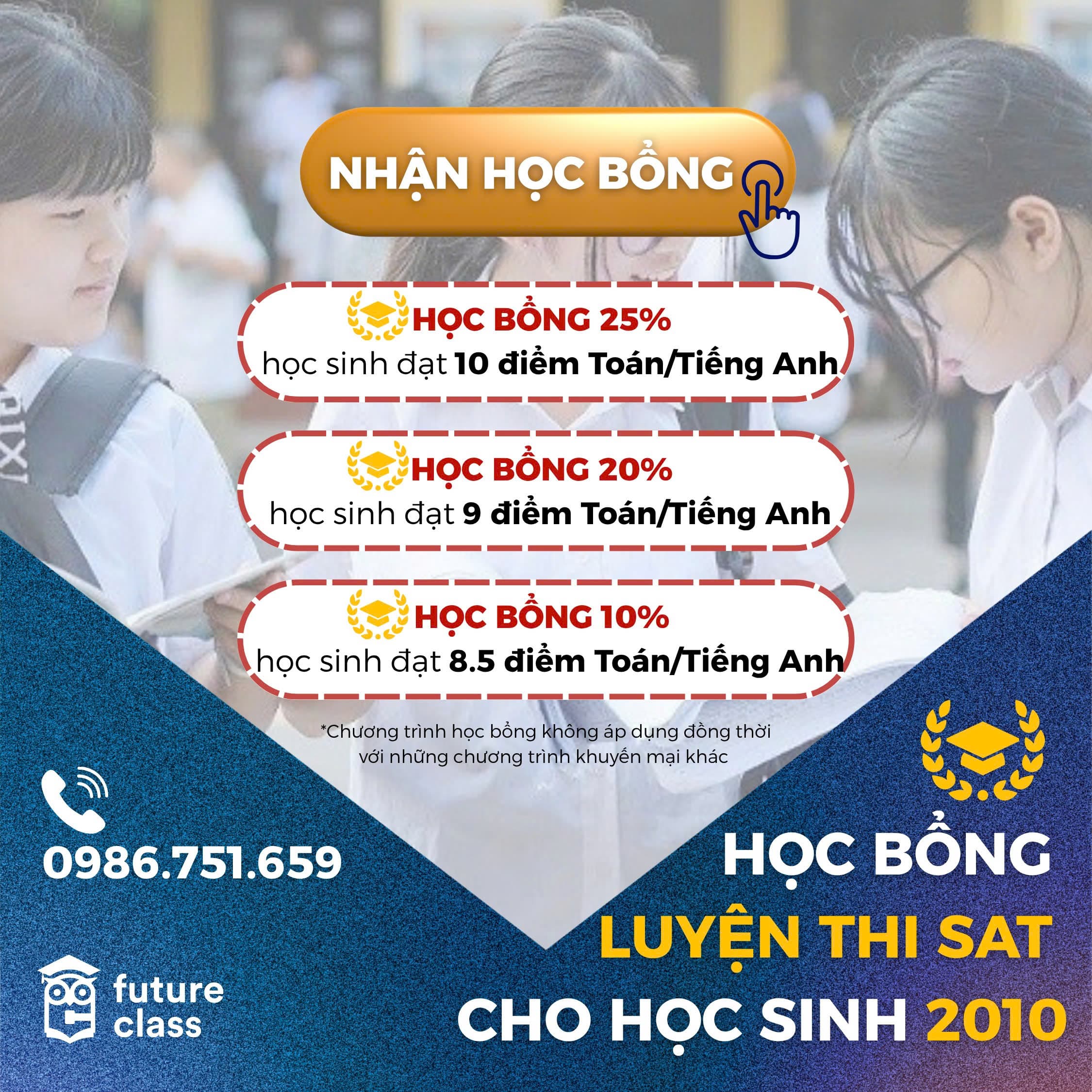• Chương trình học bổng dành tặng cho các bạn học sinh thi vào 10 tại Hà Nội có thành tích cao các môn Toán, Tiếng Anh. Khi đăng ký học SAT tại Future Class, các bạn sẽ được nhận % học bổng dựa trên số điểm thi mà các bạn đạt được.