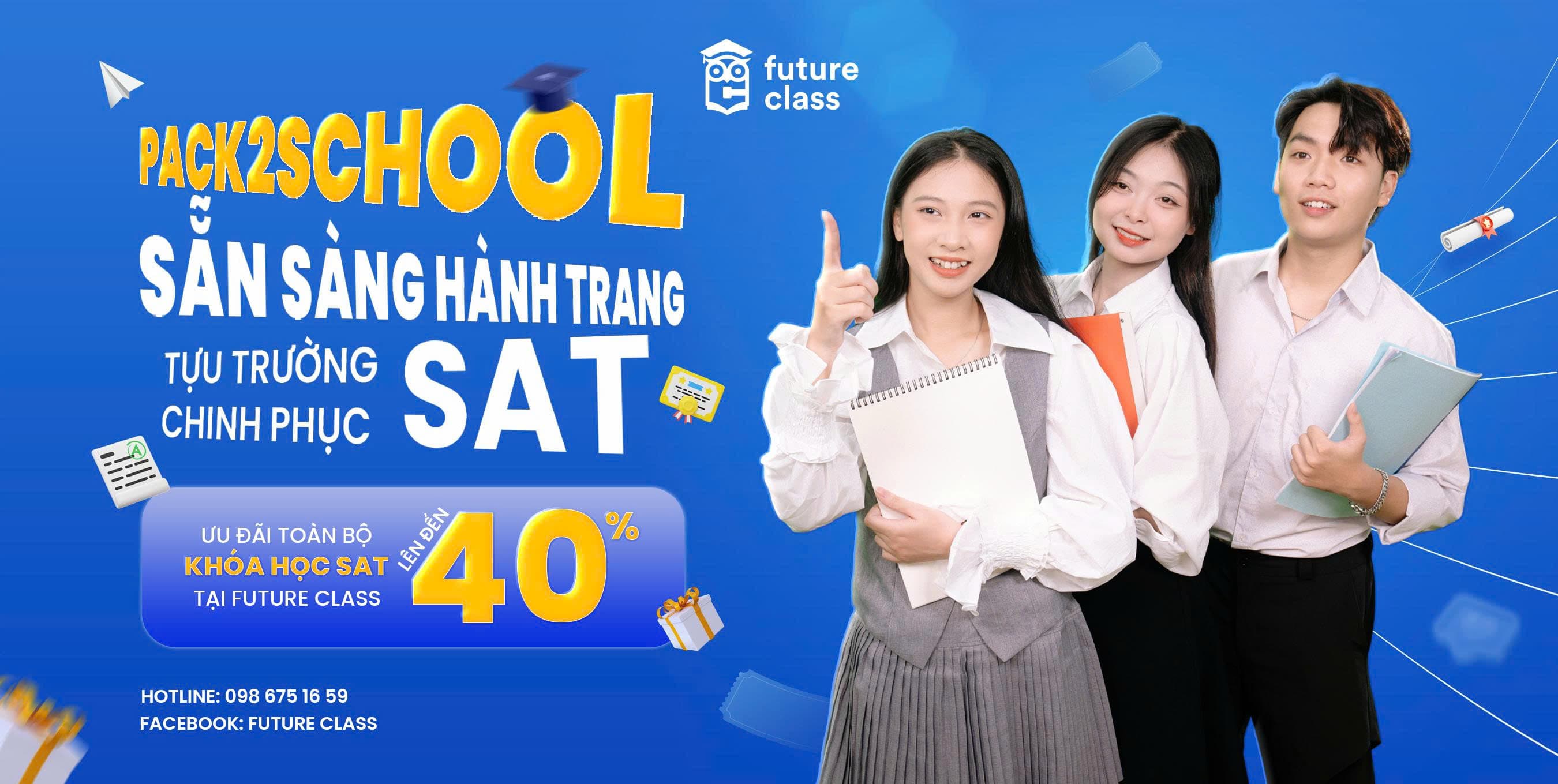 • Nhân dịp năm học mới, Future Class gửi tới quý phụ huynh và các bạn học sinh chương trình PACK2SCHOOL - Sẵn sàng hành trang, tựu trường chinh phục SAT với ƯU ĐÃI khóa học LÊN ĐẾN 40% và cơ hội nhận ngay hộp quà PACK2SCHOOL trị giá 699.000Đ, gồm: