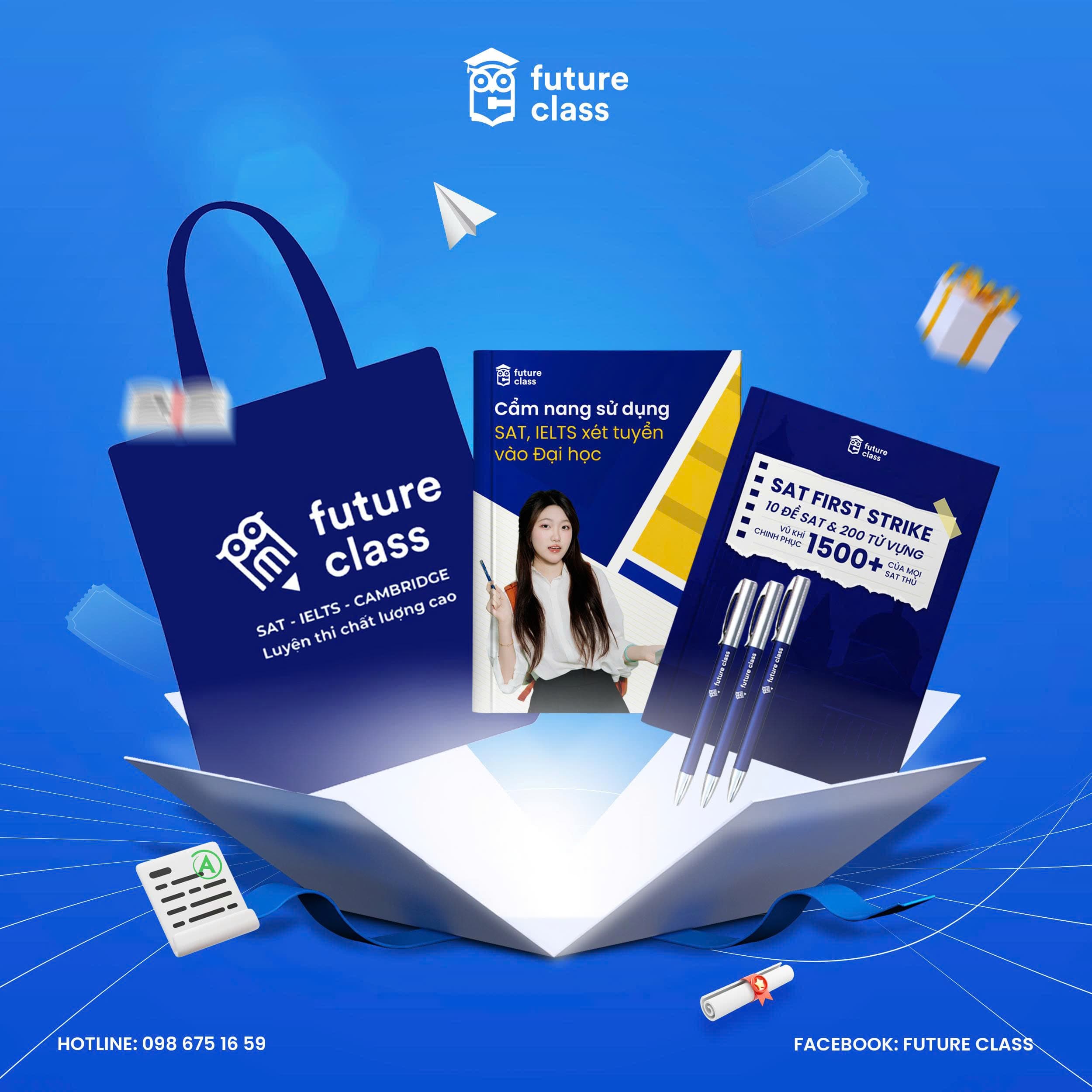 - Nhận ngay PHẦN QUÀ ĐỘC QUYỀN sau khi đăng ký học thành công gồm: Bộ 10 đề luyện SAT mới nhất, tài liệu ôn SAT do Future Class biên soạn, cẩm nang xét tuyển Đại học 2025, túi tote đa năng kèm bút viết độc quyền của Future Class.